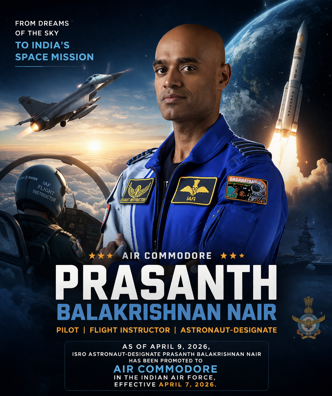 കേരളത്തിനും ഇന്ത്യയ്ക്കും അഭിമാനമായി, Prasanth Balakrishnan Nair **Indian Air Force**യിൽ എയർ കൊമഡോർ പദവിയിലേക്ക് ഉയർത്തപ്പെട്ടു. 2026 ഏപ്രിൽ 7 മുതൽ ഈ പ്രമോഷൻ പ്രാബല്യത്തിൽ വന്നു.