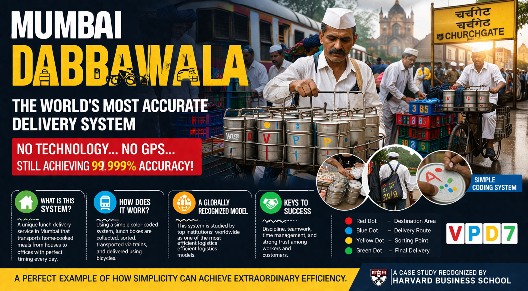മുംബൈയിലെ ഡബ്ബാവാല സംവിധാനം, നഗരത്തിലെ തിരക്കേറിയ ജീവിതത്തിനിടയിൽ പ്രതിദിനം ഏകദേശം 2 ലക്ഷം ലഞ്ച് ബോക്സുകൾ വീടുകളിൽ നിന്ന് ഓഫീസുകളിലേക്ക് എത്തിക്കുന്ന അതിവിശിഷ്ടമായ ഒരു ലോജിസ്റ്റിക് മാതൃകയായി അറിയപ്പെടുന്നു; രാവിലെ തന്നെ ഡബ്ബാവാലകൾ വീടുകളിൽ നിന്ന് ഭക്ഷണപ്പെട്ടികൾ ശേഖരിച്ച്, ഓരോ ബോക്സിനും നിറങ്ങളും ചിഹ്നങ്ങളും അടങ്ങിയ ലളിതമായ കോഡിംഗ് സംവിധാനം ഉപയോഗിച്ച് തിരിച്ചറിയൽ നൽകുകയും, തുടർന്ന് ലോക്കൽ ട്രെയിനുകൾ വഴി നഗരത്തിന്റെ വിവിധ ഭാഗങ്ങളിലേക്ക് മാറ്റുകയും ചെയ്യുന്നു. ഇടനില സ്റ്റേഷനുകളിൽ കൃത്യമായ സോർട്ടിംഗ് പ്രക്രിയകൾ നടത്തി, അവസാന ഘട്ടത്തിൽ സൈക്കിളുകളോ കൈവണ്ടികളോ ഉപയോഗിച്ച് ശരിയായ ഓഫീസുകളിലേക്ക് സമയബന്ധിതമായി എത്തിക്കുന്ന ഈ സംവിധാനം, മൊബൈൽ ആപ്പുകൾ, GPS, ഡിജിറ്റൽ ട്രാക്കിംഗ് എന്നിവ ഒന്നും ഉപയോഗിക്കാതെയും 99.999% വരെ കൃത്യത കൈവരിക്കുന്നതിനാൽ ലോകത്തെ അത്ഭുതപ്പെടുത്തുന്നു. കഠിനാധ്വാനം, സമയനിയന്ത്രണം, കൃത്യമായ ടീം കോർഡിനേഷൻ, ഉപഭോക്താക്കളോടുള്ള വിശ്വാസം എന്നിവയുടെ സമന്വയമാണ് ഈ വിജയത്തിന് പിന്നിൽ; അതുകൊണ്ടുതന്നെ ലോകപ്രശസ്തമായ Harvard Business School ഉൾപ്പെടെയുള്ള സ്ഥാപനങ്ങൾ ഈ സംവിധാനത്തെ പഠനവിഷയമായി ഉൾപ്പെടുത്തി, ലോകത്തിലെ ഏറ്റവും കാര്യക്ഷമവും വിശ്വസനീയവുമായ ഡെലിവറി മോഡലുകളിലൊന്നായി അംഗീകരിച്ചിട്ടുണ്ട്.